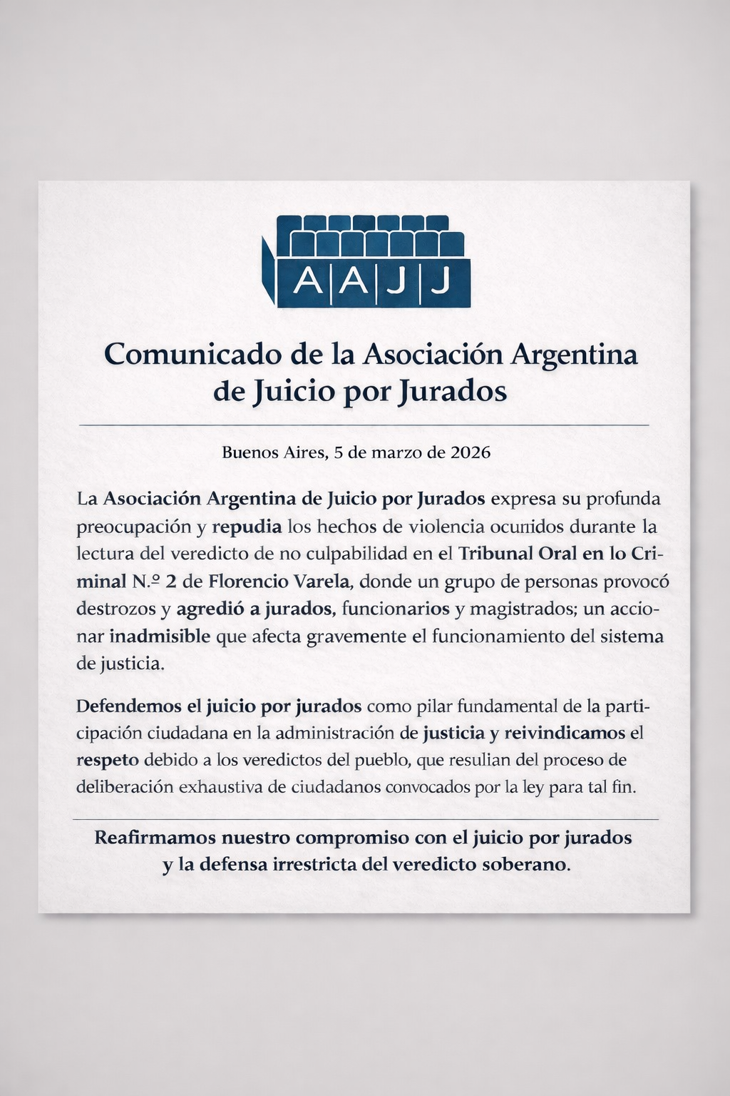 La Asociación Argentina de Juicio por Jurados expresa su profunda preocupación y repudia los hechos de violencia ocurridos durante la lectura del veredicto de no culpabilidad en un juicio por jurados realizado en el Tribunal Oral en lo Criminal N.º 2 de Florencio Varela, donde un grupo de personas provocó destrozos y agredió a jurados, funcionarios y magistrados, un accionar inadmisible que afecta gravemente el funcionamiento del sistema de justicia.